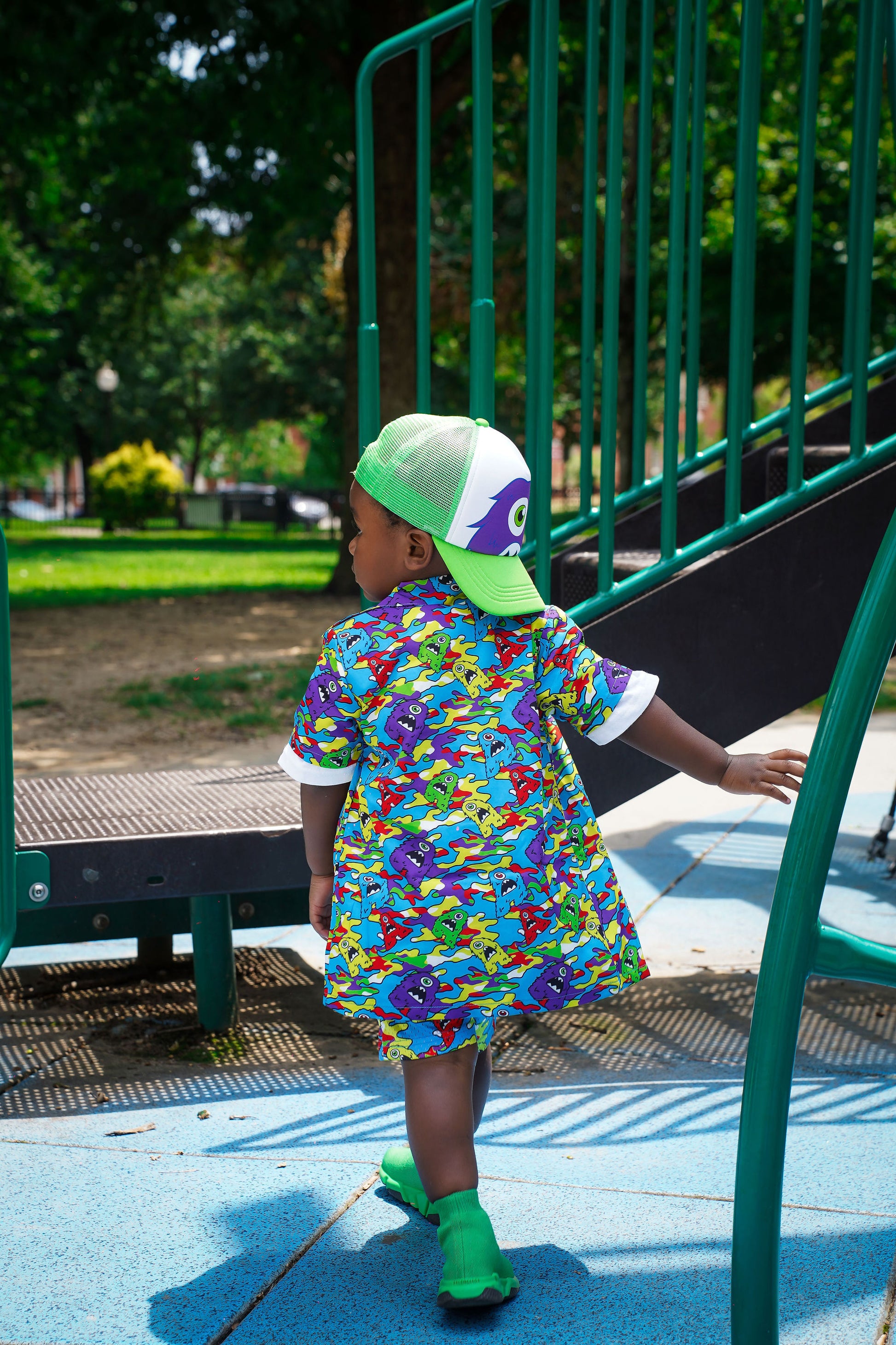 Our Archie Army Fatigue Camp Shirt is perfect for your little one's active lifestyle. Made of 100% polyester, this shirt is both comfortable and breathable. It features Play Monster Archie all over print with a unique army fatigue design for a fun and stylish look. This shirt is sure to be a hit with your kids.